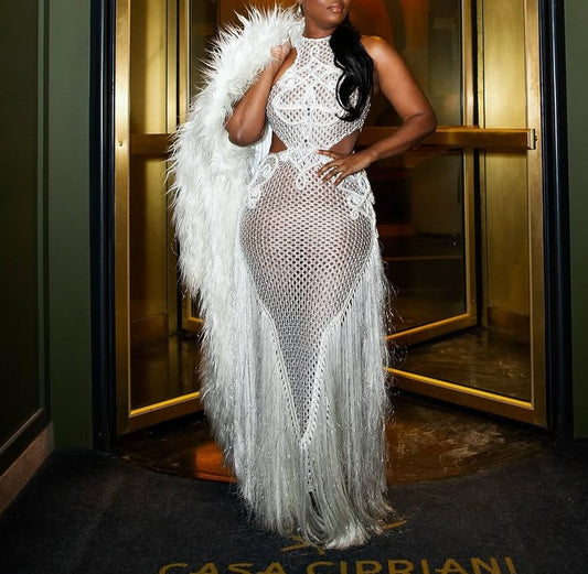 Embroidered hollow sleeveless tassel dress