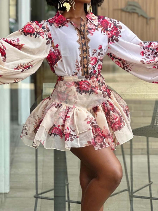 Floral Print Flouced Two Pieces Dress