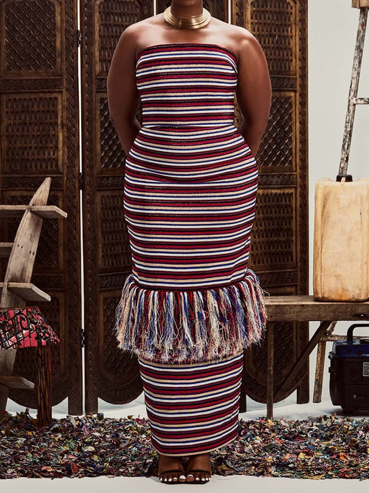 Striped Print Strappless Tassles Dress