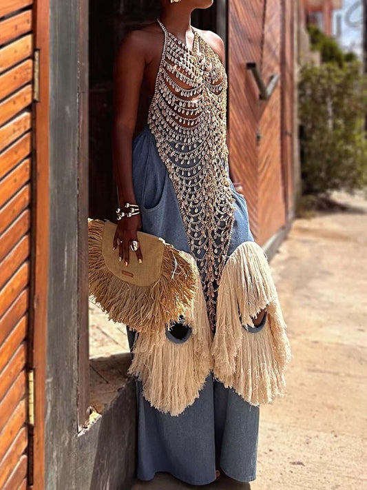 Halter Neck Sexy Hollowed Out Vest & Tassel Pants