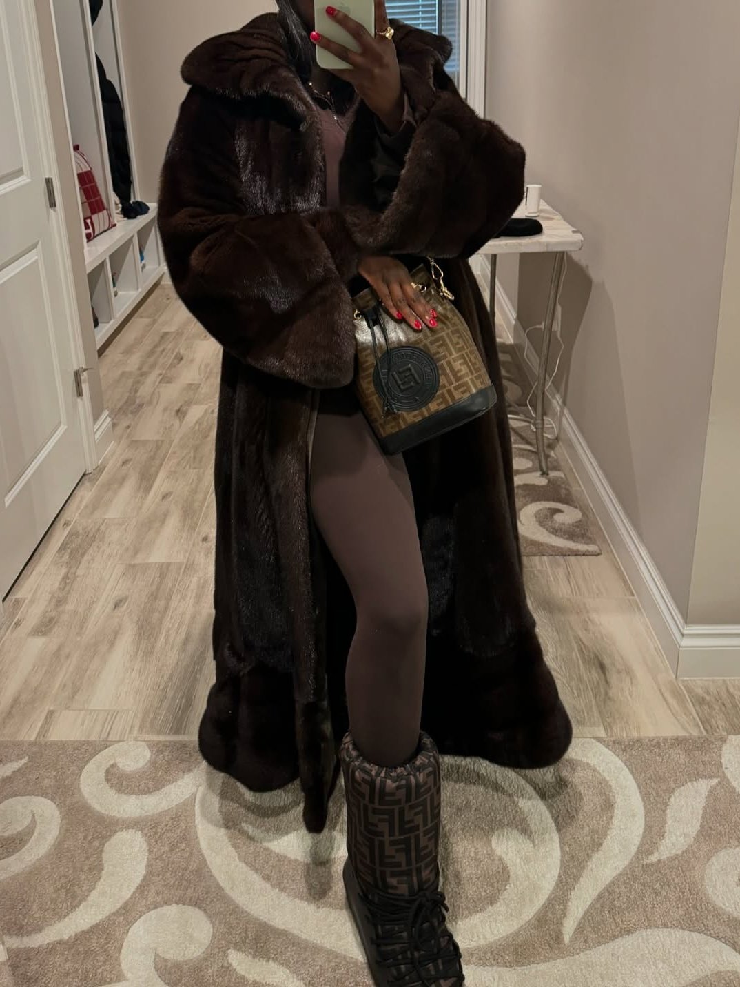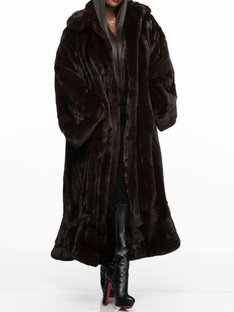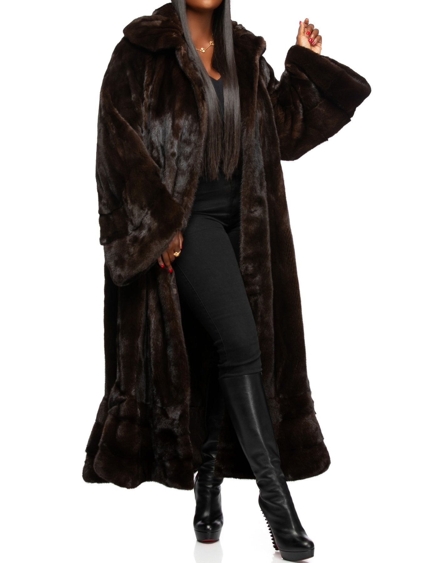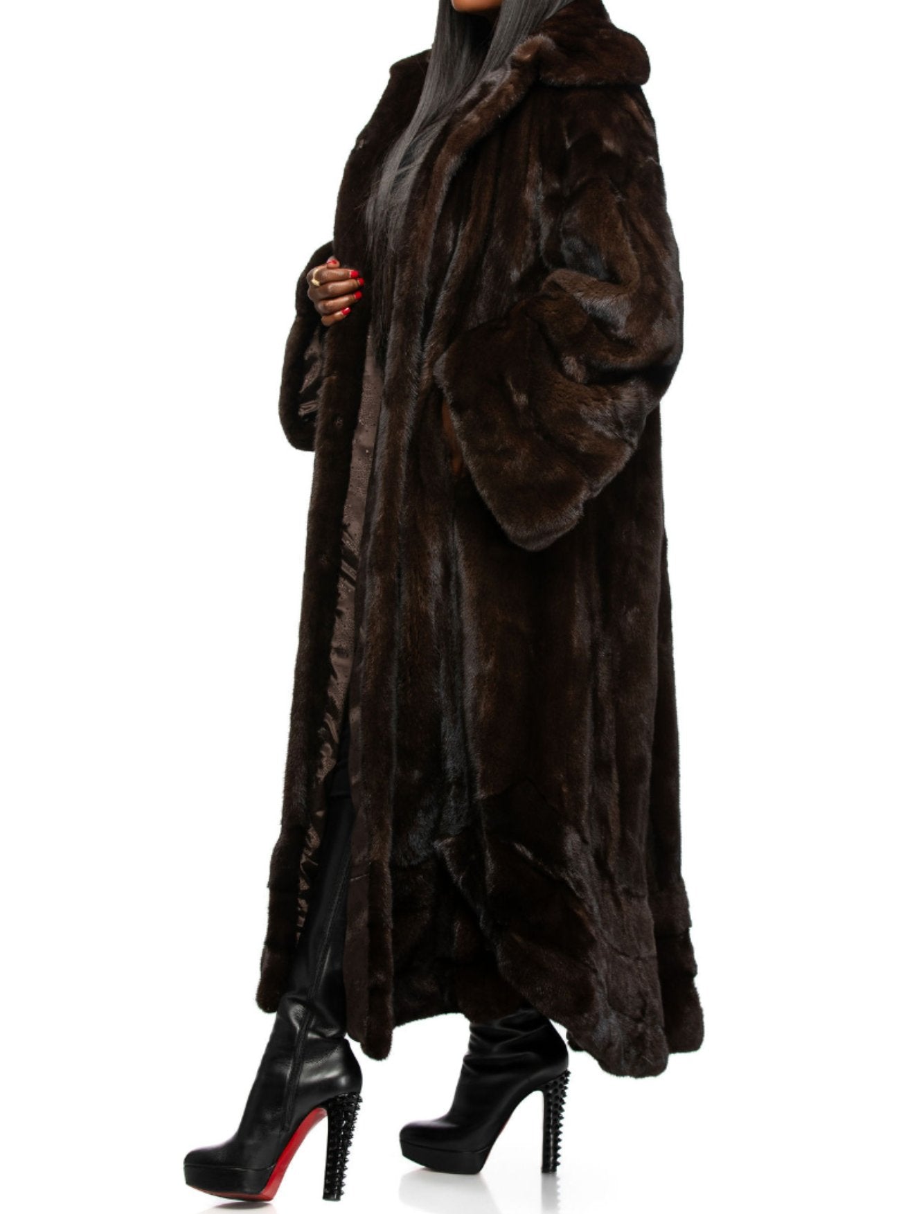 - The full length swing mink is one of the classiest and luxurious furs in our collection. This stunning coat is a swing style that features an oversized collar, hook closure, bell sleeves, and pockets. Due to the swing style, this Fur runs large. Please order one size down for a more tailored fit.