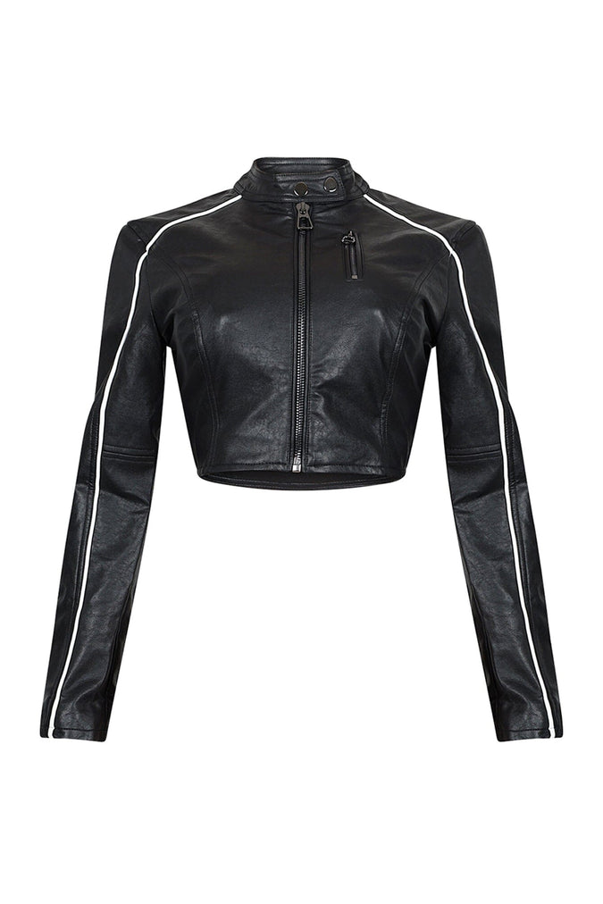 PU long sleeve crop jacket featuring piping detail
