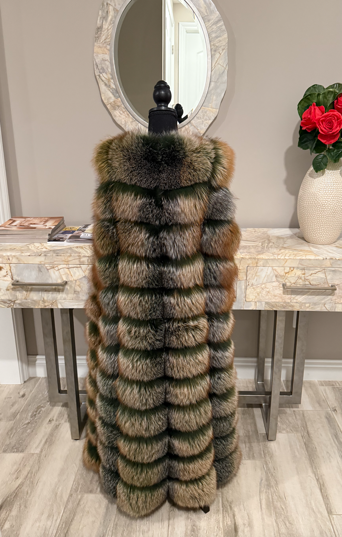 The Full Length Fox Fur vest is an iconic pice that will keep you stylish and warm. This vest features 100% genuine fox fur panel, is lined with satin, and closes with hooks. The length of this vest is approximately 130cm/ 51 inches. This vest runs true to size. If you want a more relaxed fit, please order one size up. Model is typically a size Large and is wearing a size XL in the color mean green.